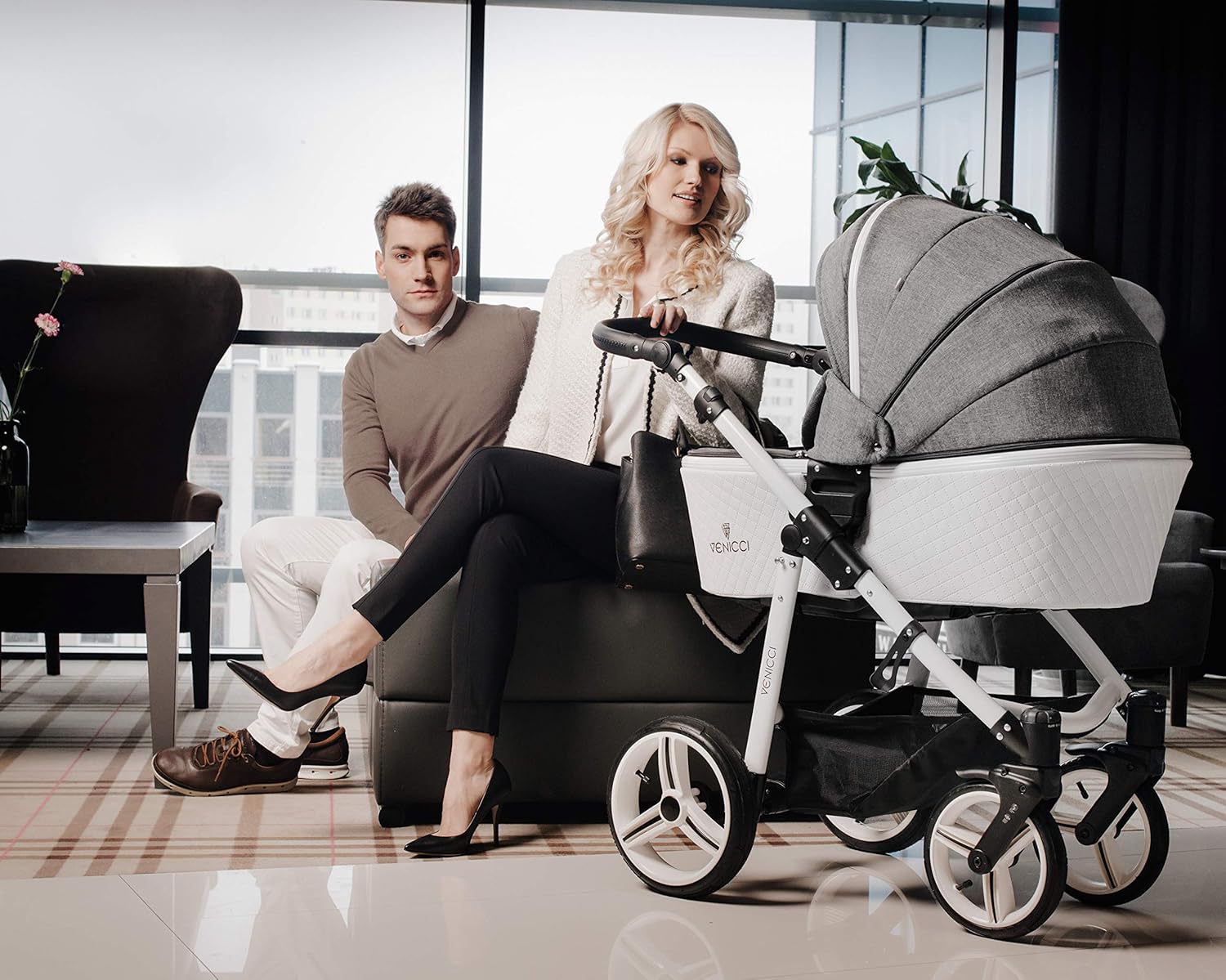Travel System - Denim Grey/White venicci pram with fur