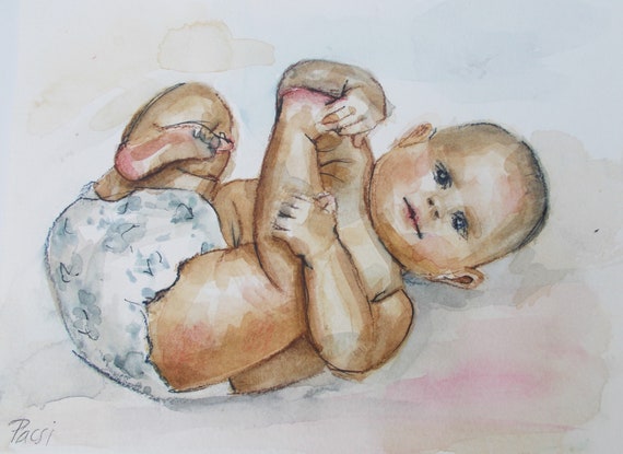 Original Watercolor painting with Cute cute baby painting