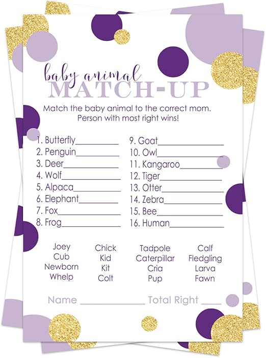 Purple and Gold Baby Shower Animal baby shower activities for kids