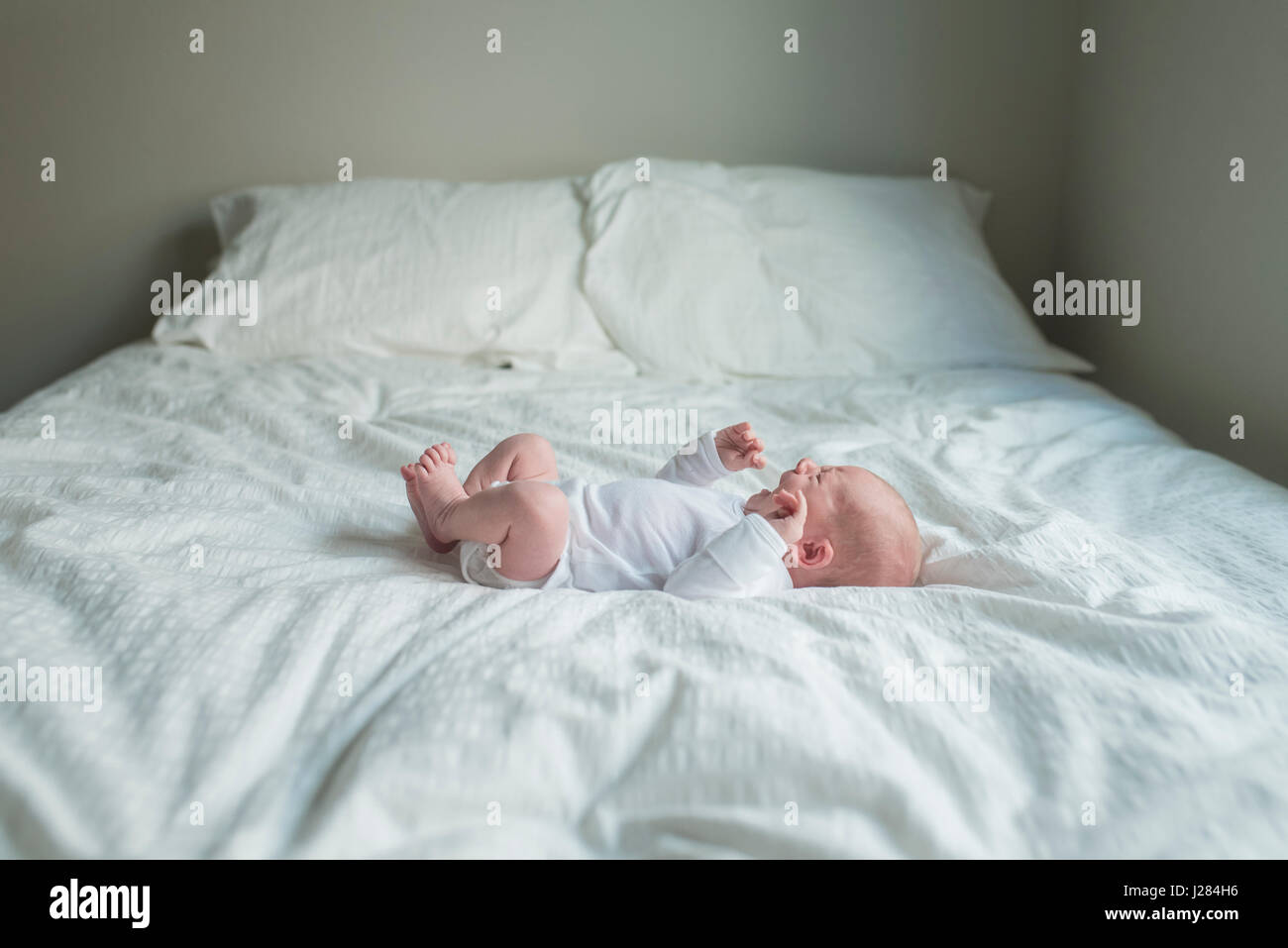 newborn baby boy crying while lying newborn baby in bed