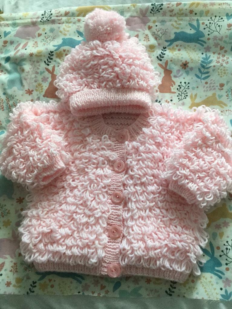 Hand knitted loopy cardigan and hat set loopy cardigan baby clothing
