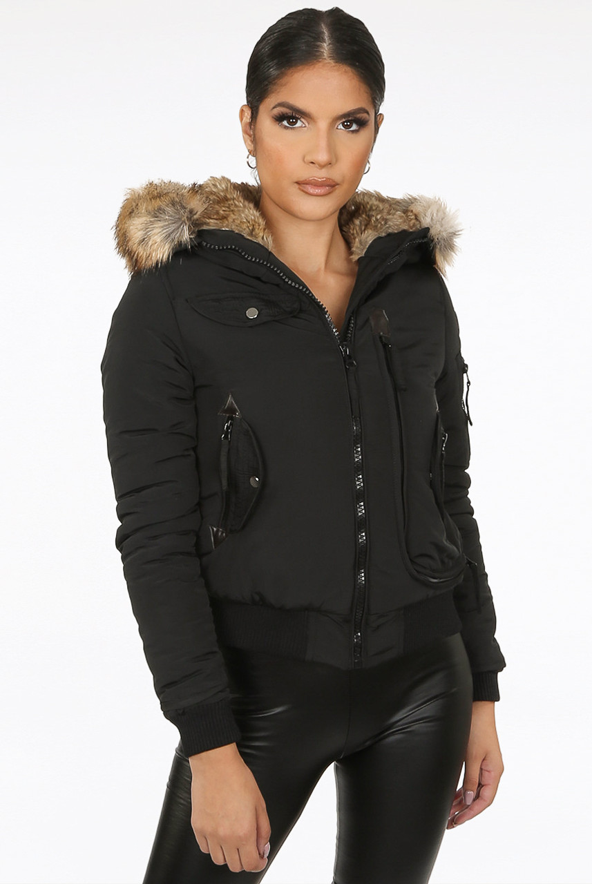 Black Faux Fur Hooded Bomber faux fur hooded bomber