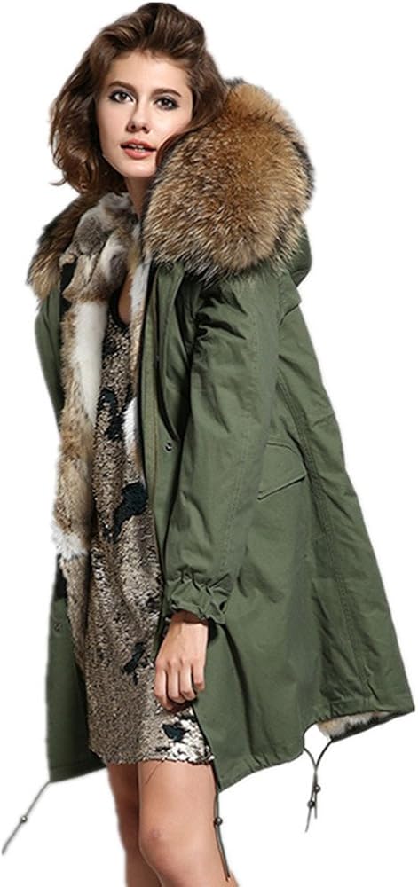 Large Raccoon Fur Collar Hooded womens army green parka with fur hood